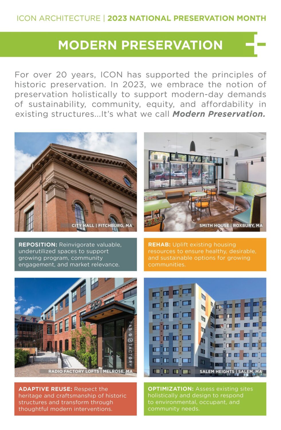 Together, these strategies define ICON’s vision for Modern Preservation. By balancing respect for the past with the realities of the present, we aim to create architecture that is sustainable, inclusive, and deeply connected to the communities it supports.