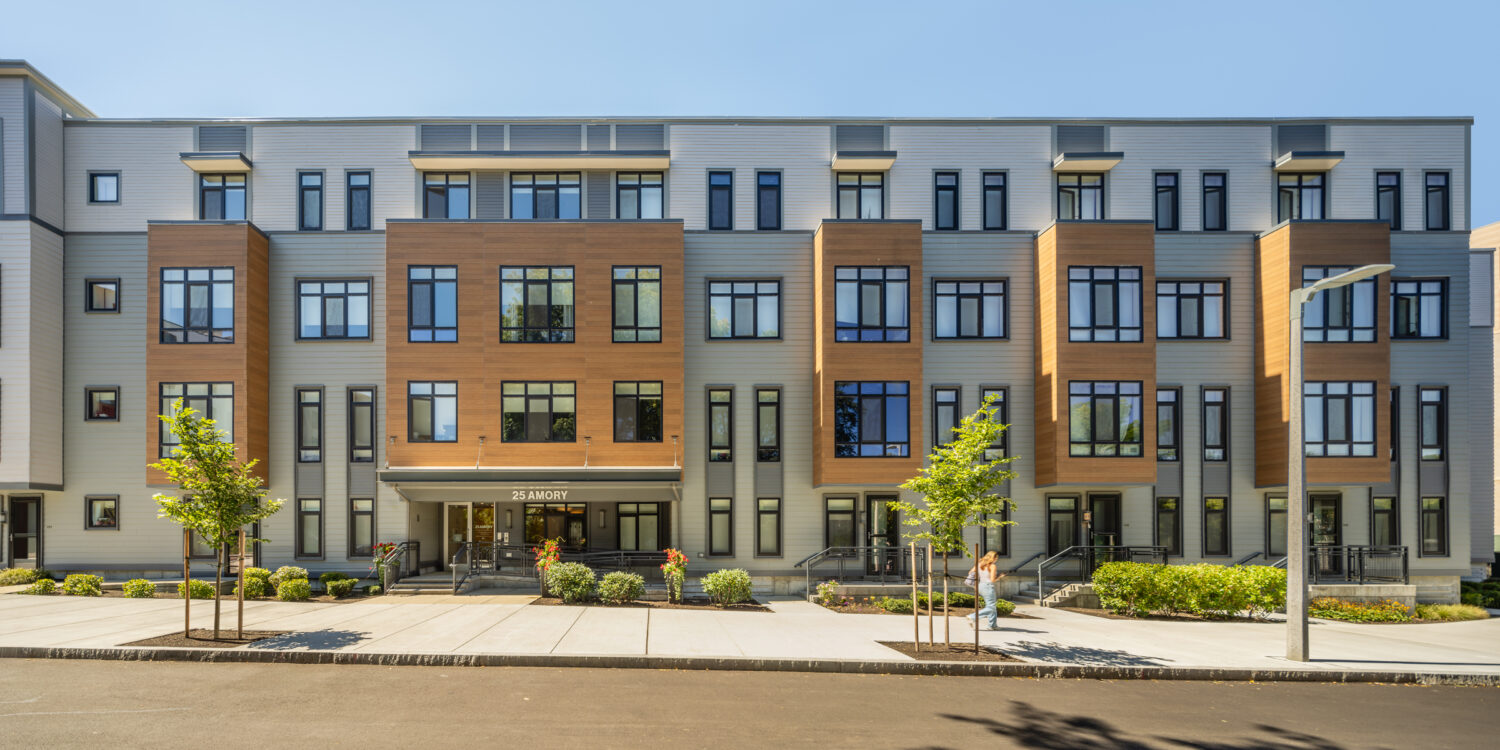Once a vacant lot, cleared as part of the halted I-95 highway project, 25 Amory turns the corner with a gracious clerestory bay and a rhythm of stoops along the well-traveled connection to Jackson Square Station.
