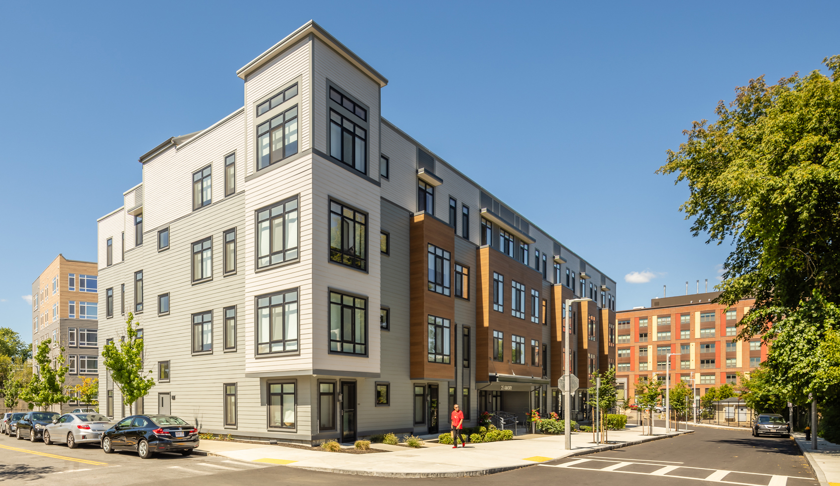 The main residential entry porch spills daylight through the building to the community room and landscaped courtyard beyond. In addition to the residential use, new streets with broad sidewalks and street trees connect the larger redevelopment as one of the final phases of the decades-long Jackson Square Master Plan. The improved streetscape is enlivened by two-story bays and inviting front stoops, adding texture to this transitional transit-oriented site.