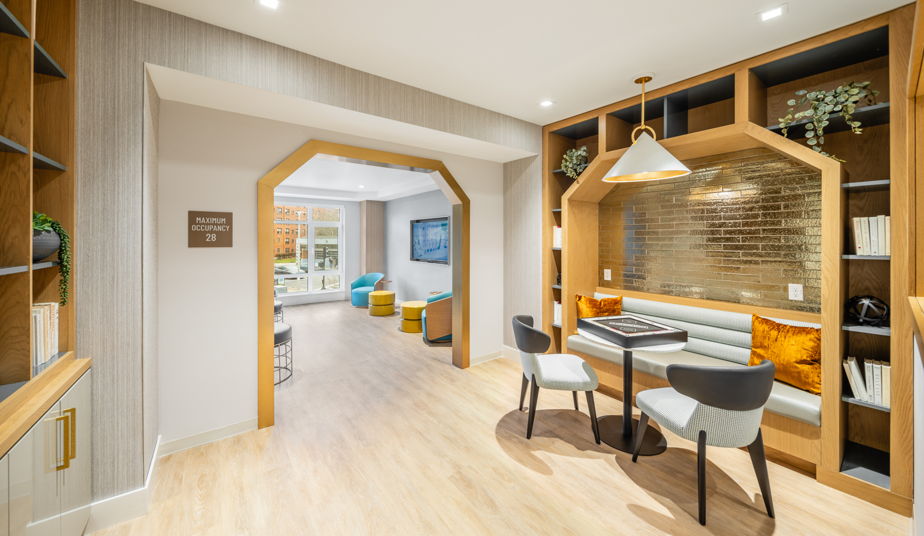 Directly across the street from the MBTA Orange line station, the primary facade responds to both the immediate neighborhood and the scale of the city, bringing a crisp new look to Jackson Square. Tall angled bays turn to face towards downtown, while playful bays set a staccato rhythm along the linear Greenway Park parallel to the train corridor. An inviting outdoor plaza allows the ground floor restaurant space to engage the public realm with a broadened sidewalk. The 110 mixed-income apartments are enhanced by resident amenities including a roof deck and lounge, second floor reading / work-from-home space, and ground level fitness club and gracious clubroom.