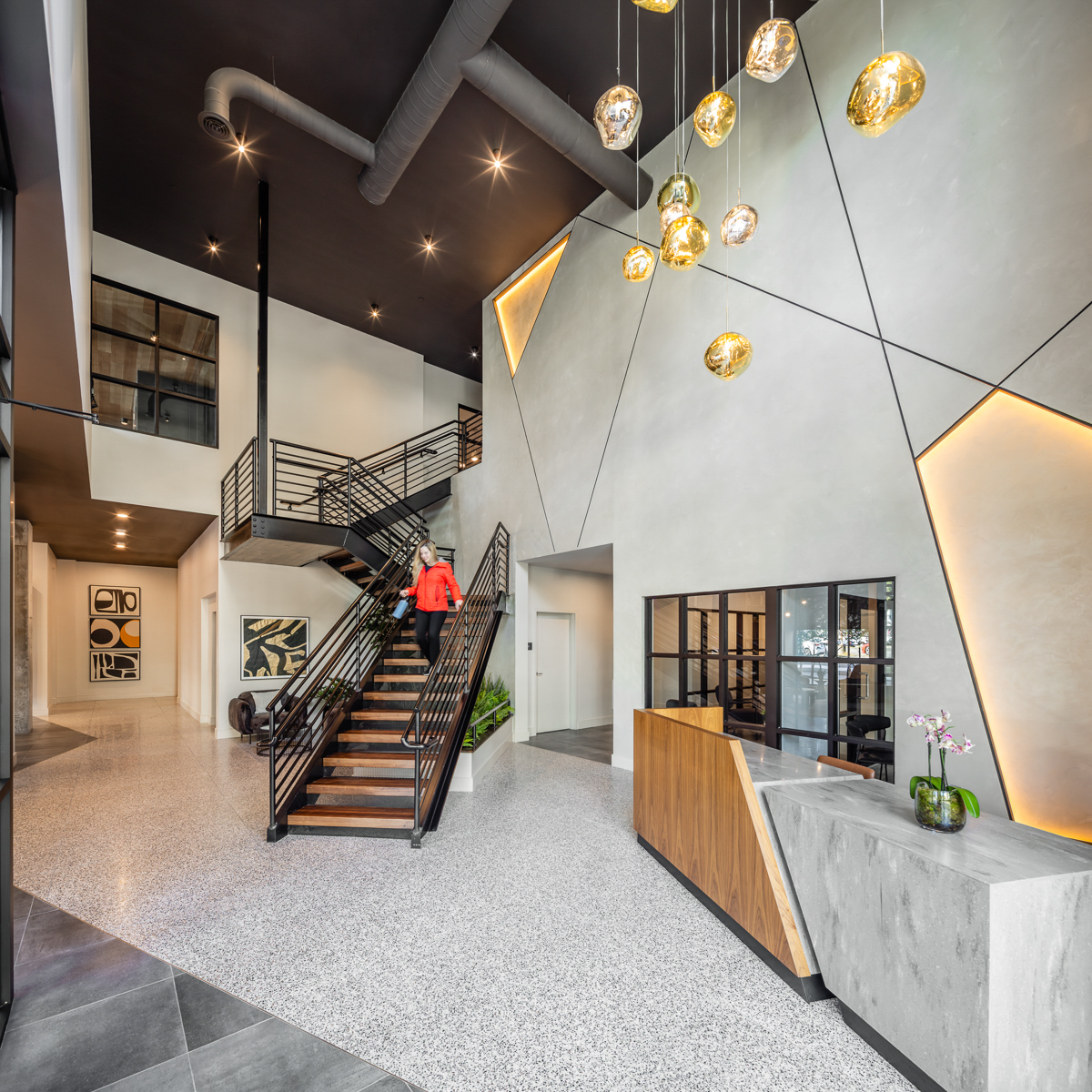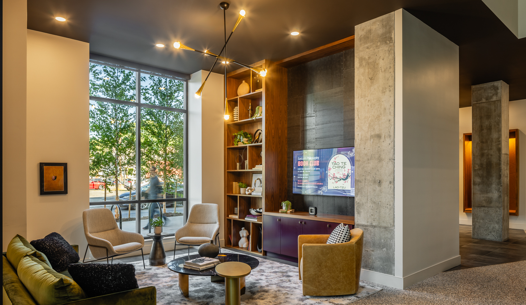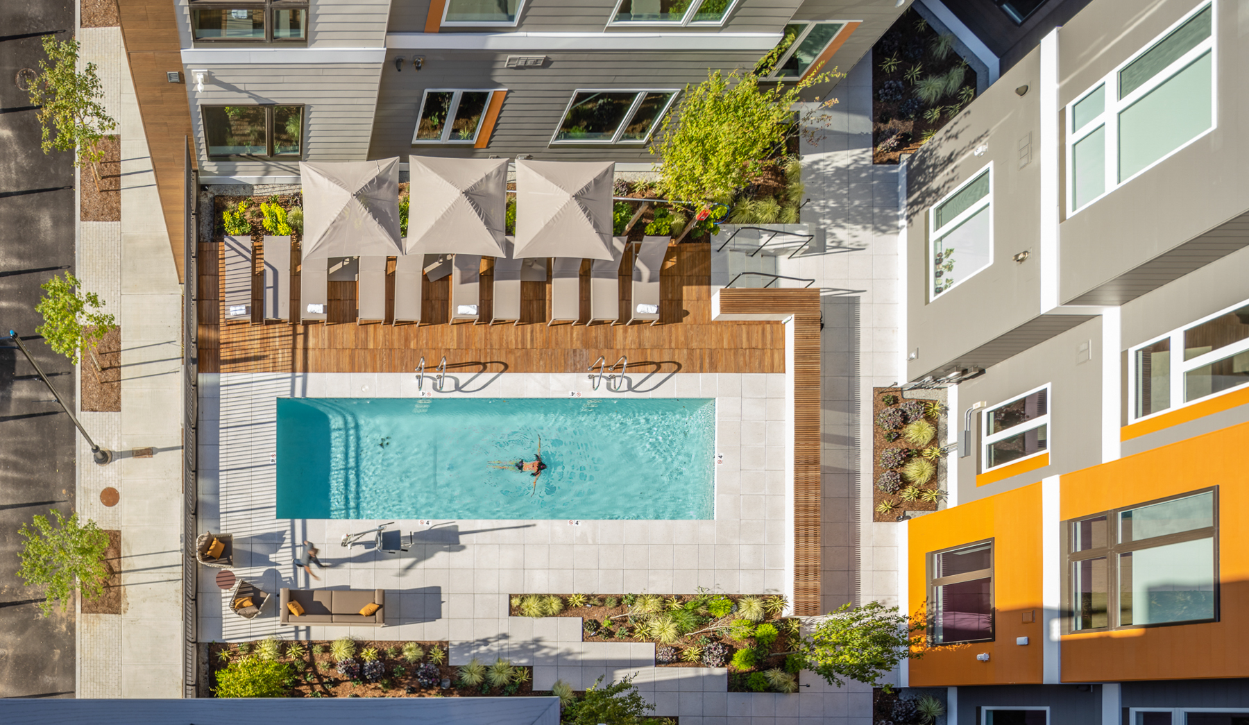 Built to meet “high-rise” wood code requirements, the design boasts a palette of warm, natural colored rusts and tans. The E-shape wraps two landscaped courtyards overlooking the main street; a trellis along the façade hints to the lush setting above. Robust building volumes push and pull to break down the scale and mass of the building; deep insets for decks and windows at corners focus views on key entry portals.