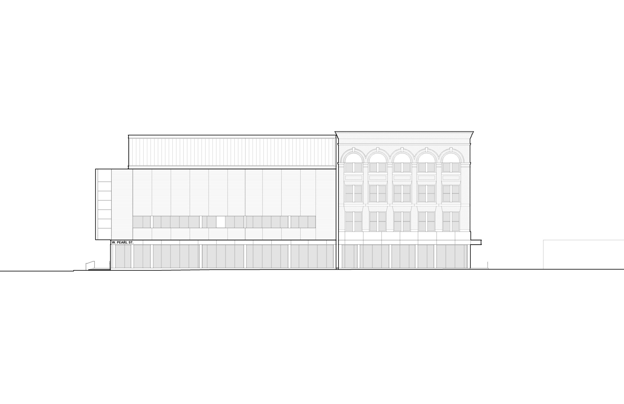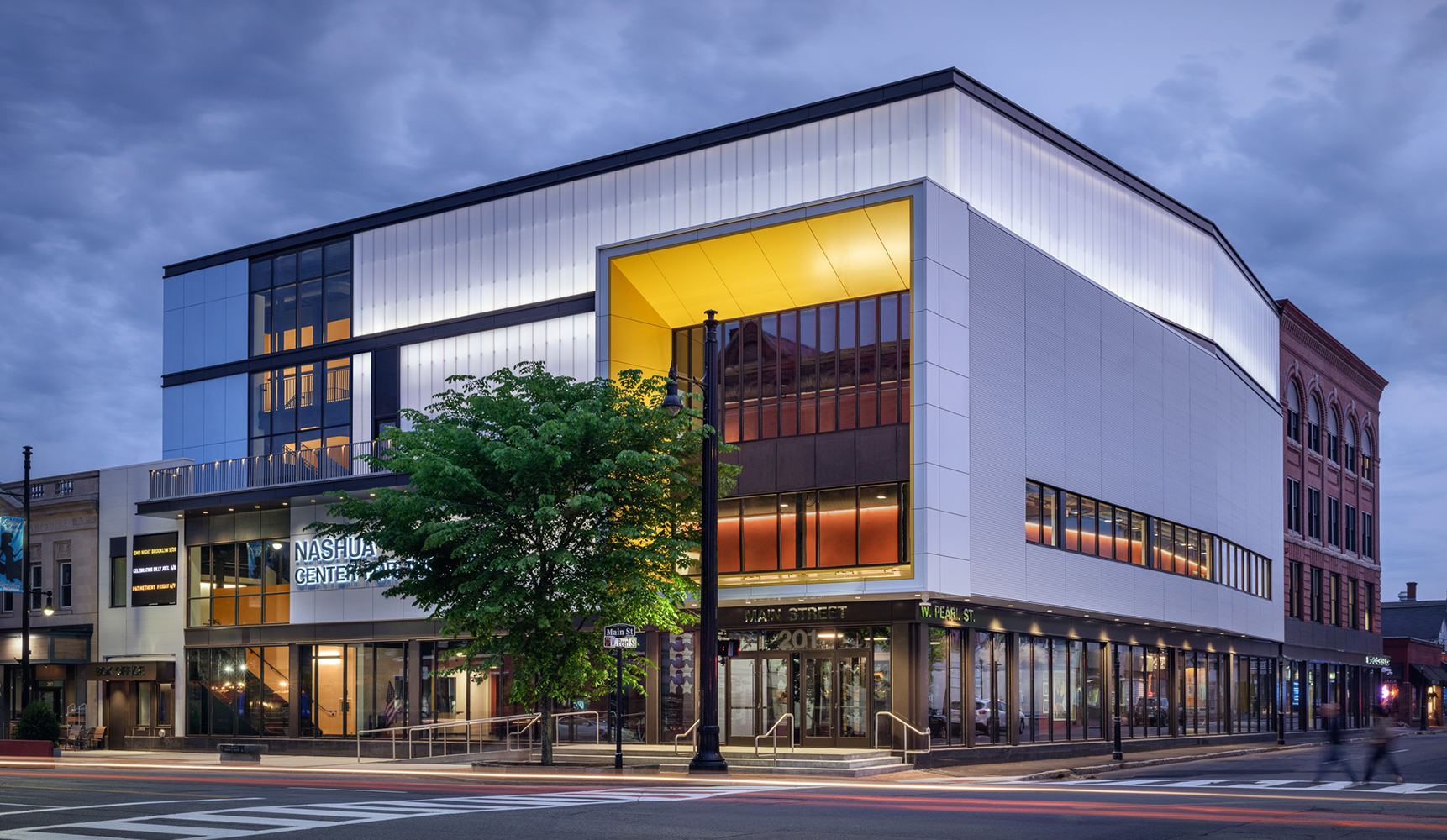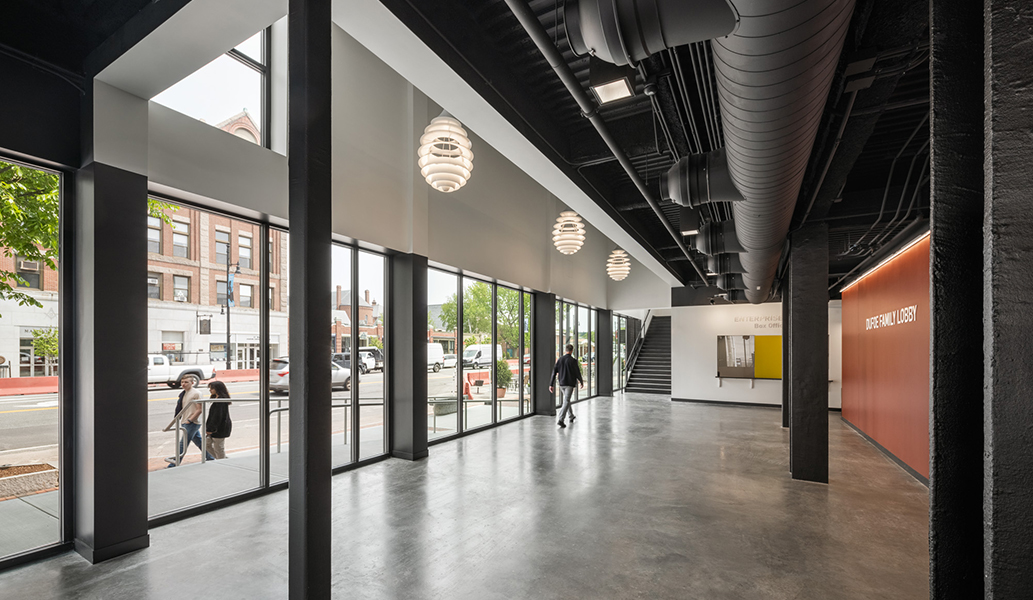 Located on the corner of Main Street and West Pearl Street, the dense urban site for the Center for the Arts was occupied by two buildings. The first, a 1960’s era 2-story + basement commercial store sharing a side party wall with a restaurant, and a rear party wall with a 1924 four-story apartment building. After a detailed assessment, the design team recommended retaining the apartment building and demolishing the commercial building down to its foundations. The foundations were kept for the economic benefit of retaining the existing streets. The audience chamber, stage, and front of house functions are constructed on the foundations of the commercial building. Additional lobby and back of house functions are housed in the apartment building. For economy and accessibility, the orchestra and balcony floors of the performance space are aligned with the apartment building floors.