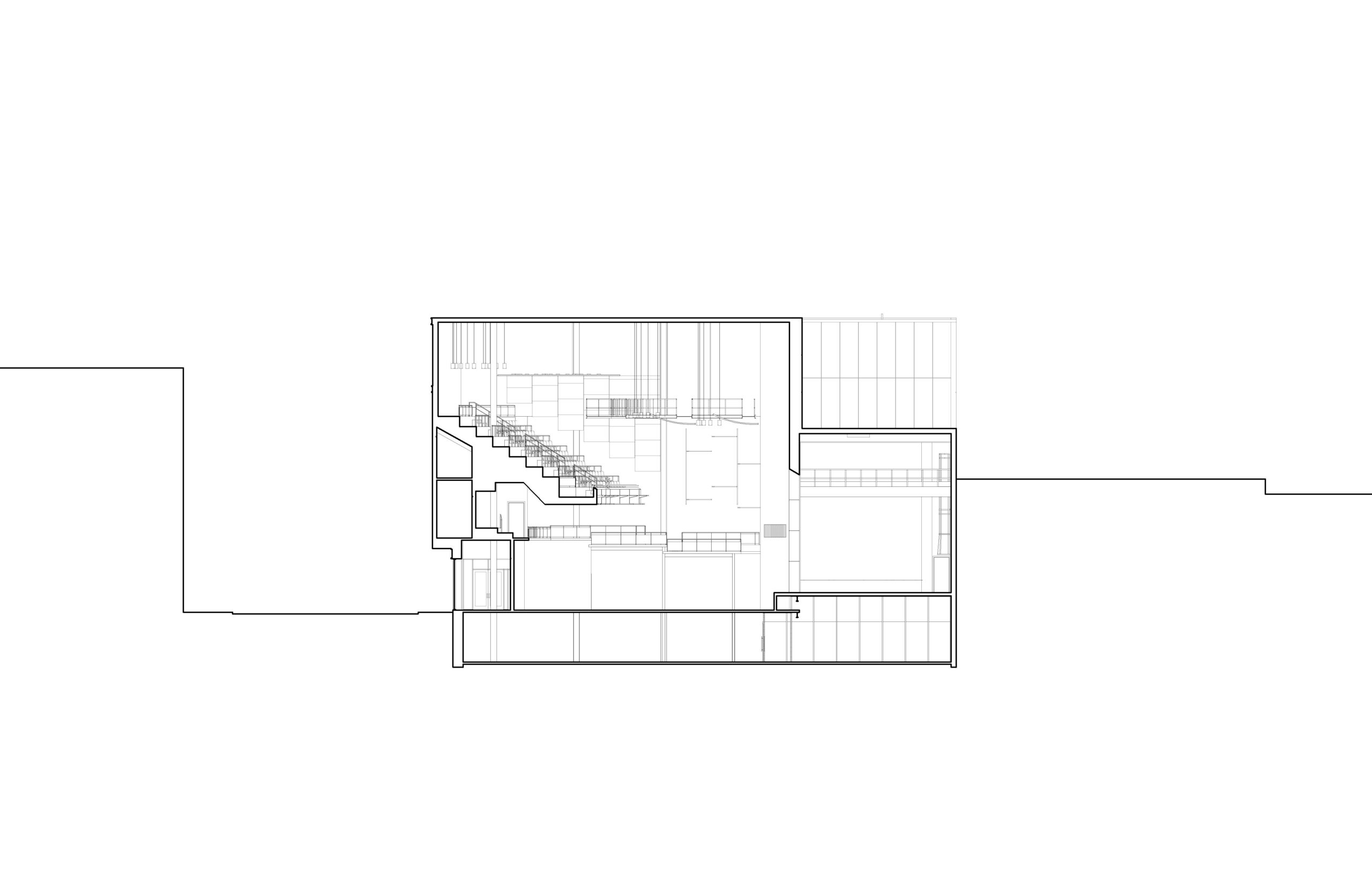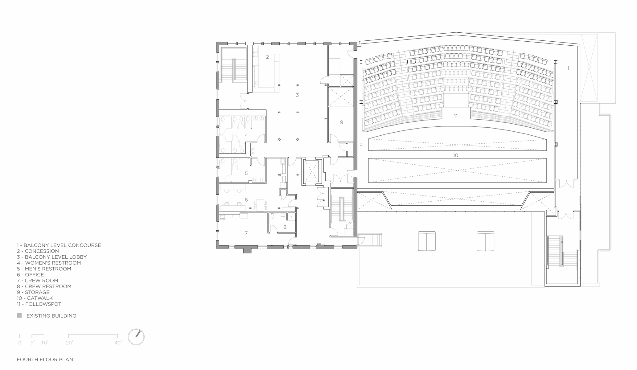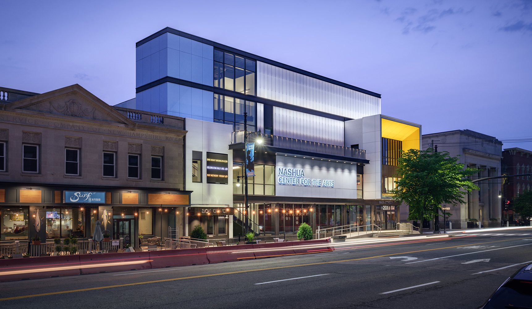 Located on the corner of Main Street and West Pearl Street, the dense urban site for the Center for the Arts was occupied by two buildings. The first, a 1960’s era 2-story + basement commercial store sharing a side party wall with a restaurant, and a rear party wall with a 1924 four-story apartment building. After a detailed assessment, the design team recommended retaining the apartment building and demolishing the commercial building down to its foundations. The foundations were kept for the economic benefit of retaining the existing streets. The audience chamber, stage, and front of house functions are constructed on the foundations of the commercial building. Additional lobby and back of house functions are housed in the apartment building. For economy and accessibility, the orchestra and balcony floors of the performance space are aligned with the apartment building floors.
