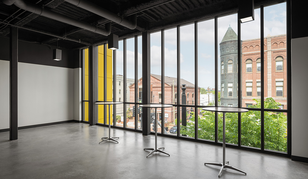 The center has two entrances, one on Main Street and the second on W. Pearl Street with a glass-walled concourse connecting them running along W. Pearl Street. This approach beneficially links a city parking garage to the center, while simultaneously activating the secondary commercial street. On Main Street, the lobby is viewed through large windows at street level and an outdoor terrace located on the third floor overlooks downtown.