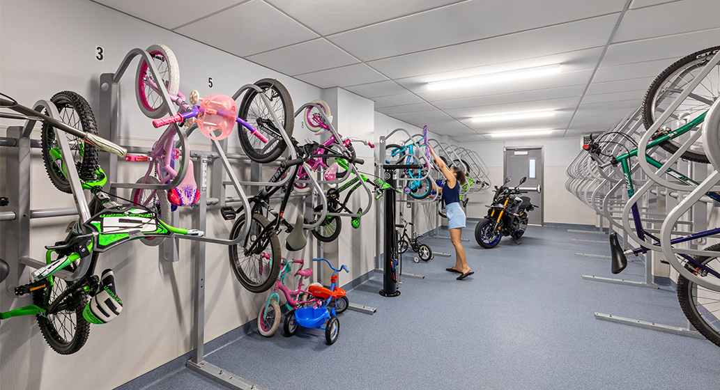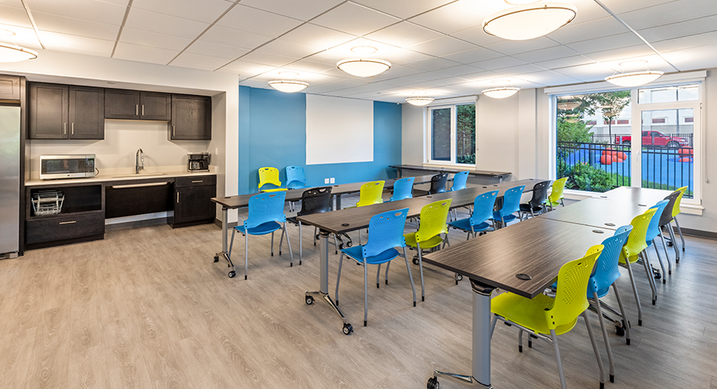 The main level of the building features a 1,000 square foot community room, with kitchenette and restrooms, as well as nearby management suite and maintenance storage and offices. A seating nook by the front lobby provides a spot for residents to meet a neighbor or wait for a friend. Bike storage and a sunny laundry room round out the resident common spaces. Residents and neighbors enjoy the secure play area, designed to facilitate creative play, comprised of simple volumes and soft surface materials in bright colors.