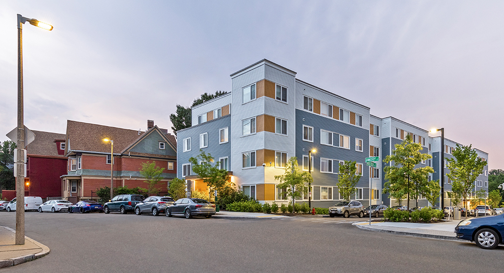 The Amory Street corner tower marks the entrance to the site at the new street, while the heart of the new 100% affordable residential community is near the main entrance, facing onto the proposed central park. Reminiscent of the nearby scale and proportions of a traditional triple decker, the length of the building is broken into an array of volumes stepping down the sloped street. Drawing from the vibrant neighborhood context of Victorian homes, bold accent color enlivens the façade.