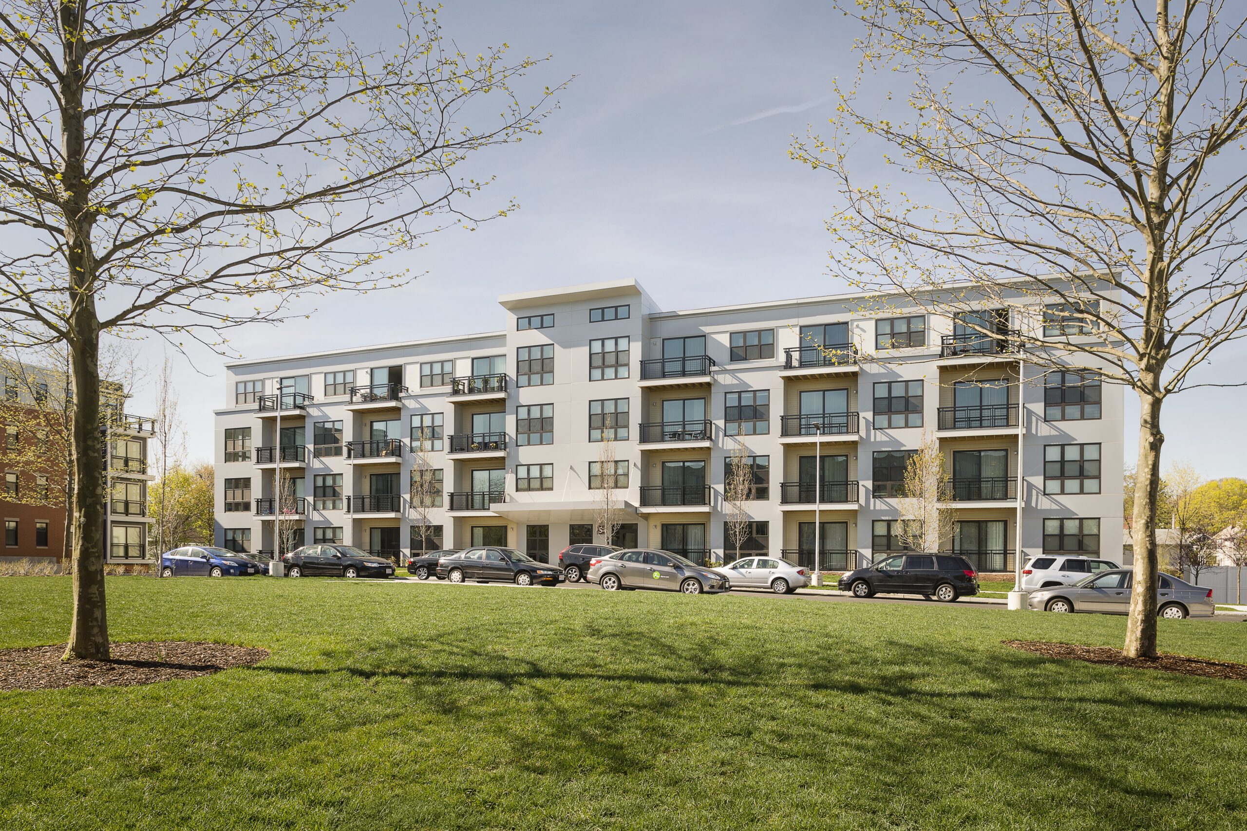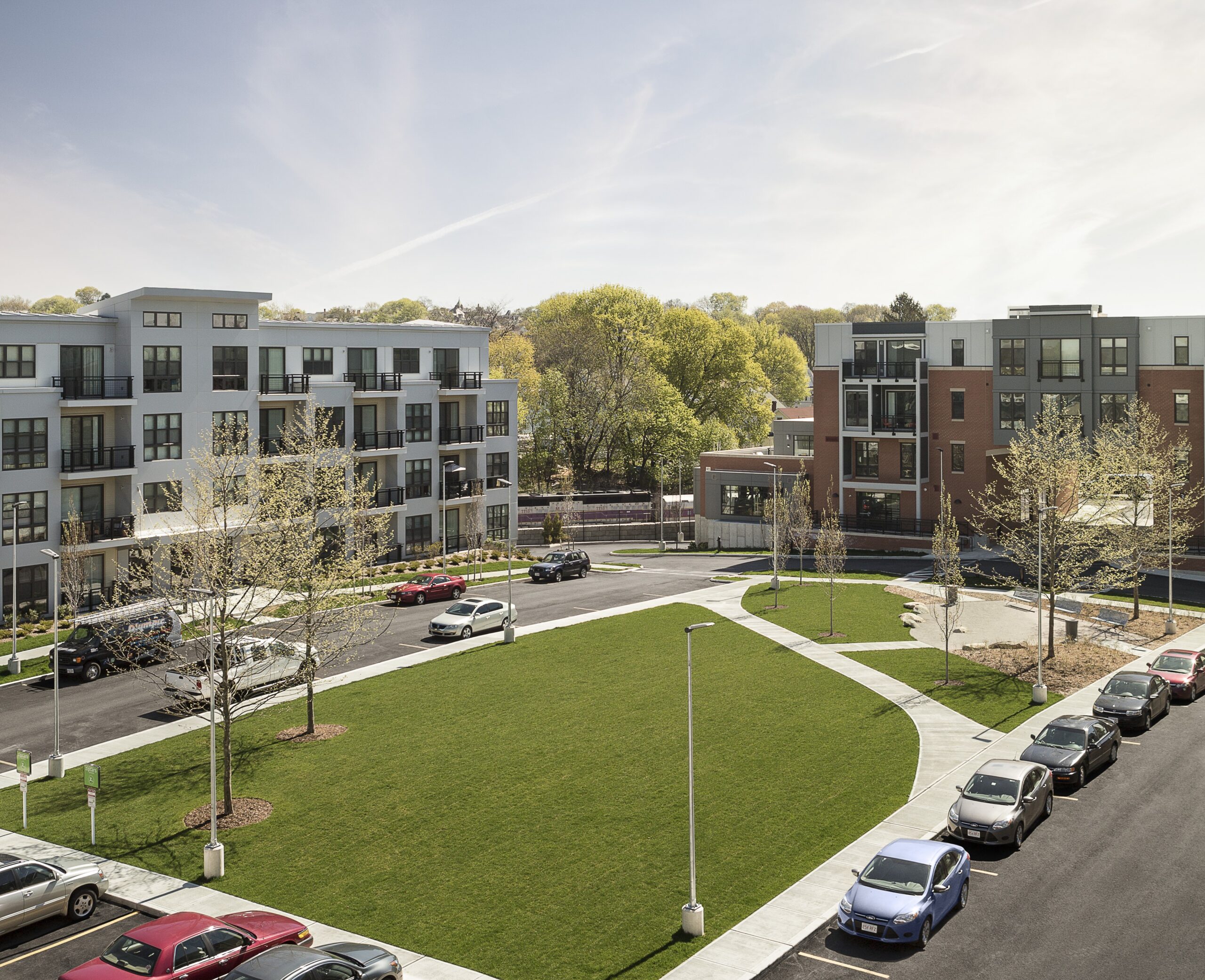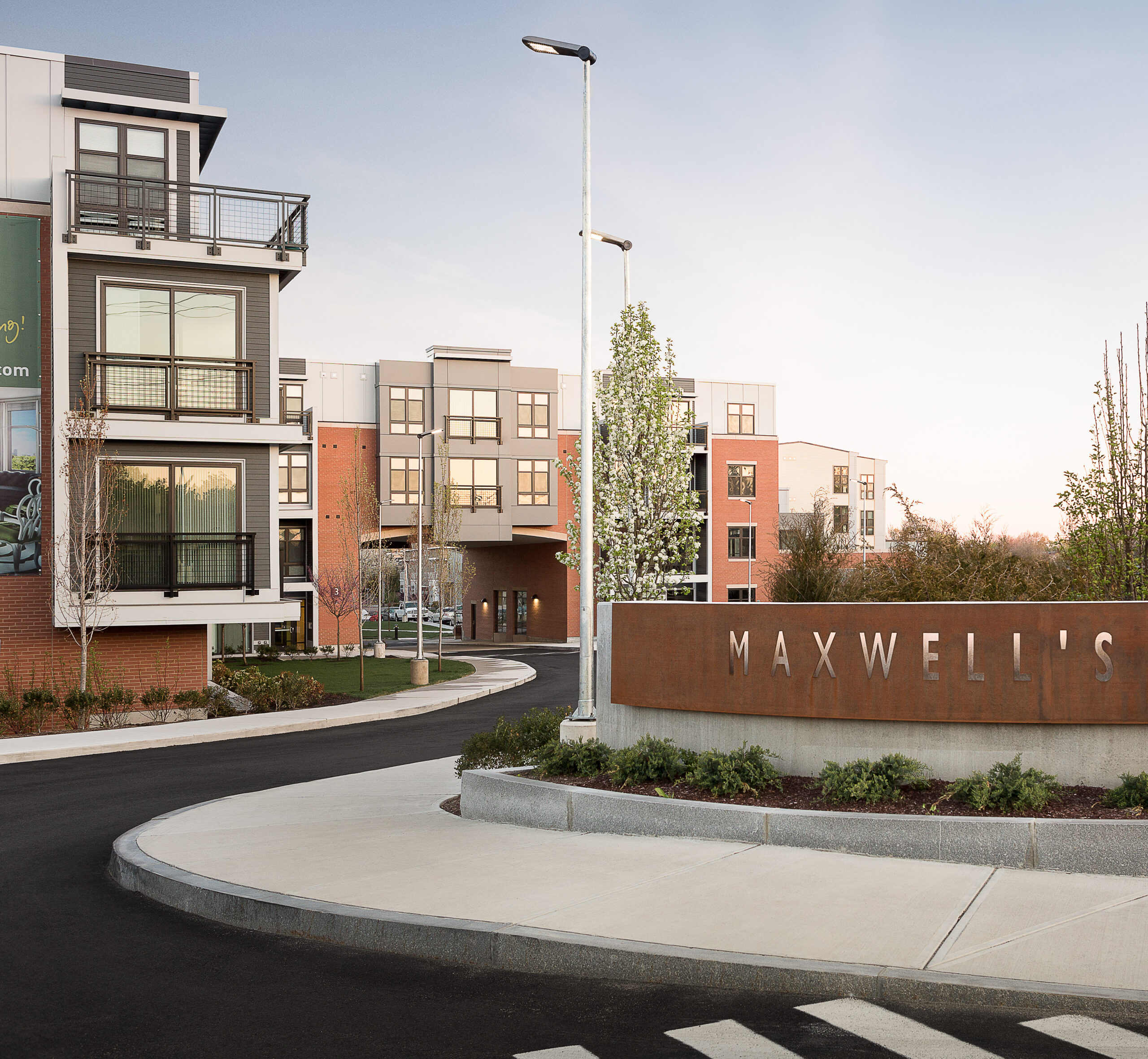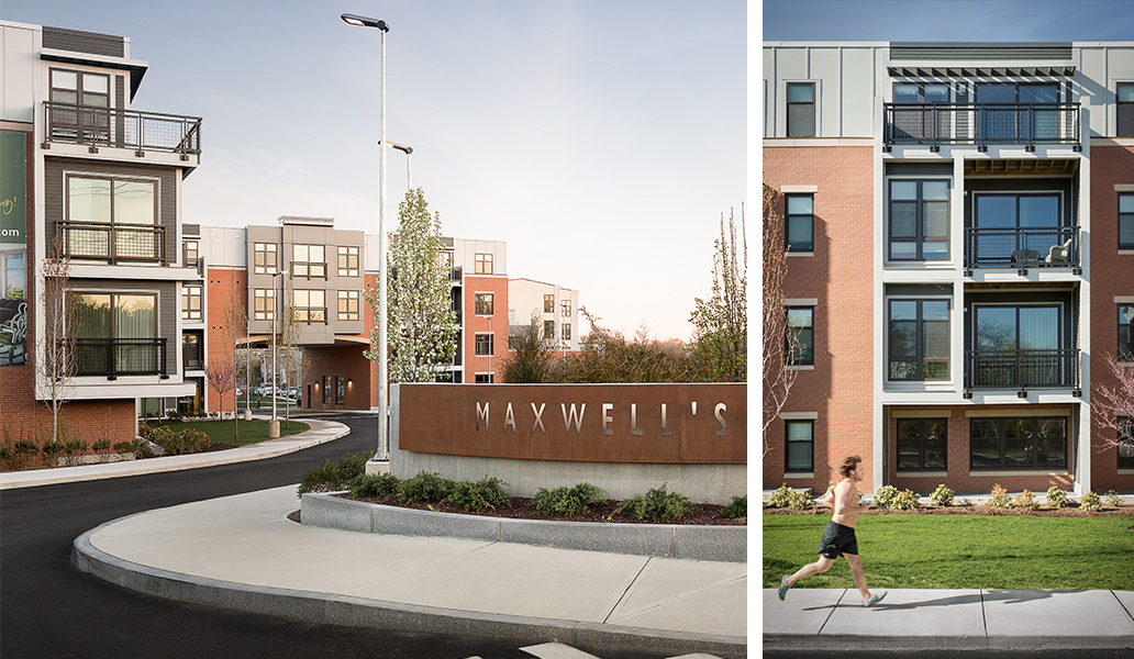 Tucked into a dense urban neighborhood, Maxwell’s Green has transformed a former industrial site into a walkable, transit-oriented community. New streets engage the central public green, and link the Community Path, a popular public way for bicycling and walking, with a near future planned transit station at the site’s entry.
