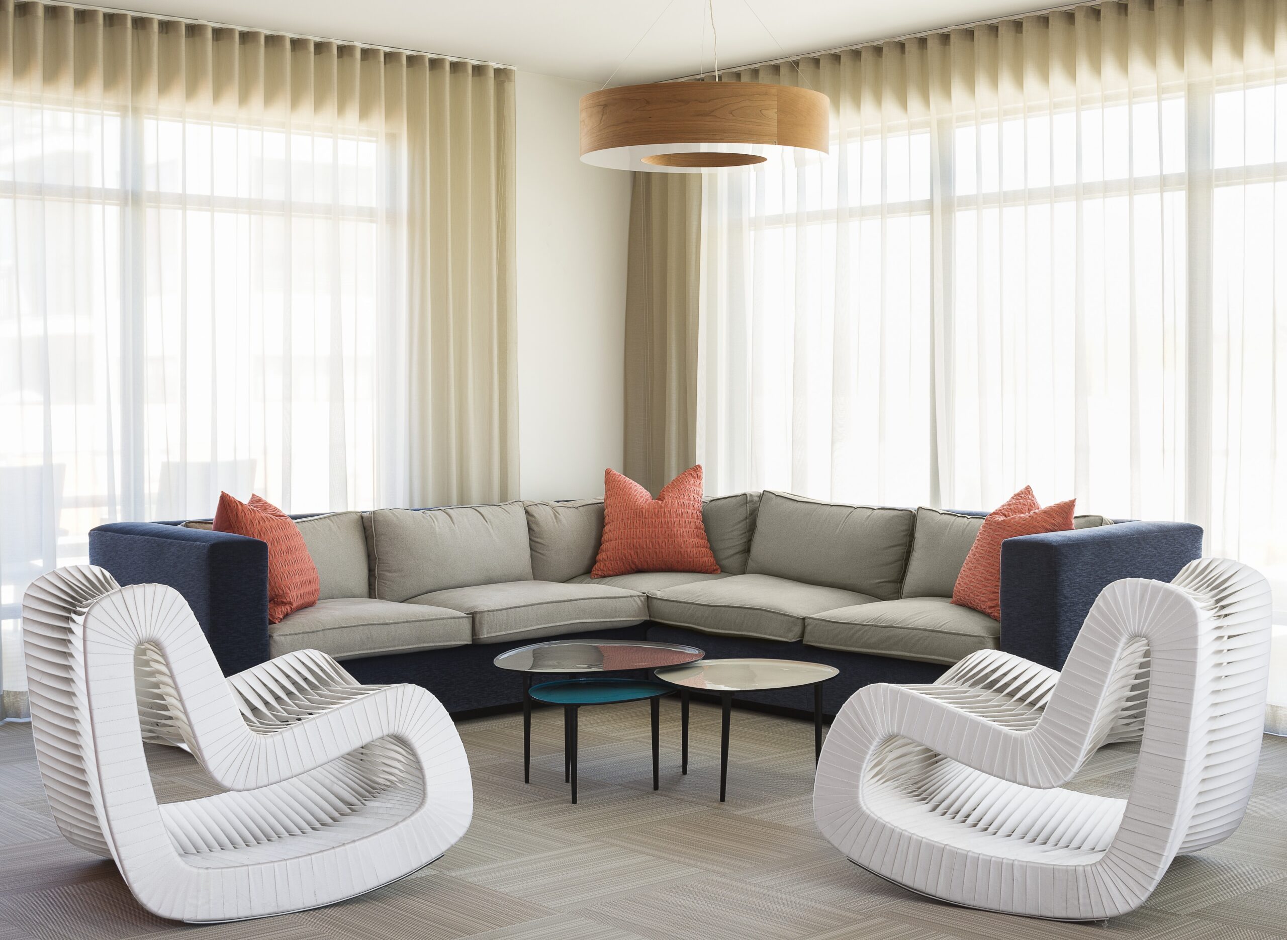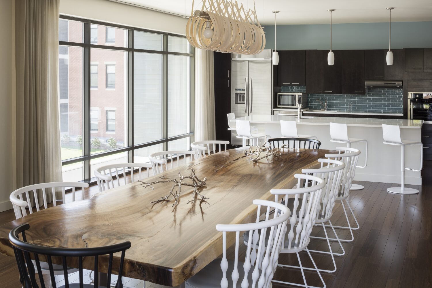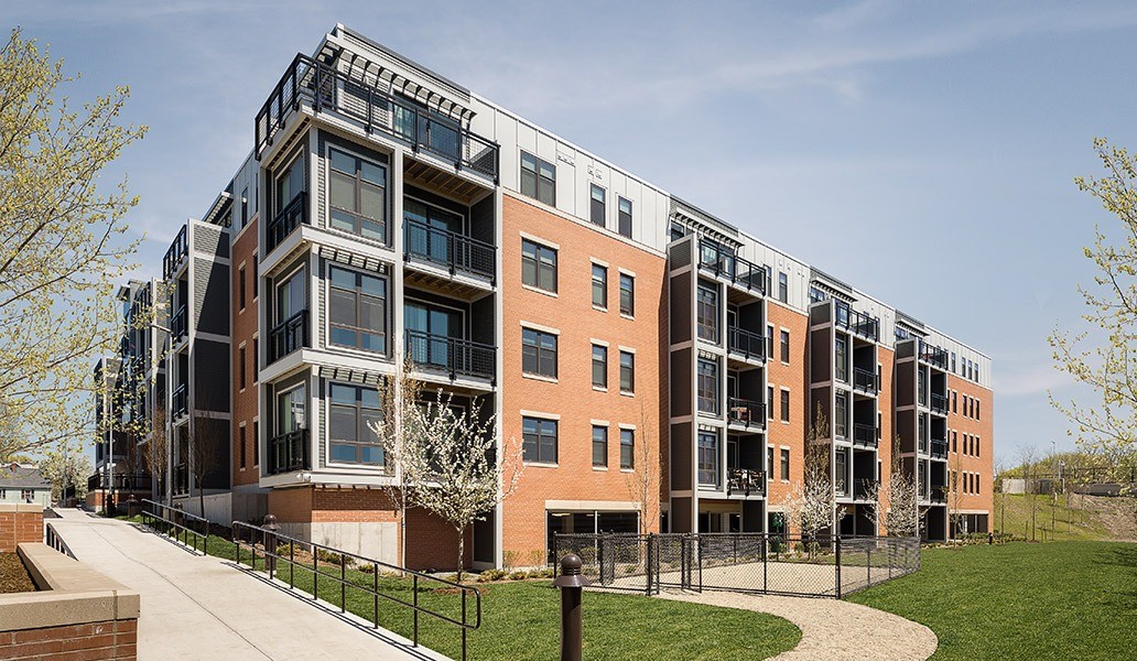 Entry signage, building identification, and historic markers interpret the site’s industrial past, yet play upon an intended hipster vibe. Four separate buildings, each with below grade parking, display a varied design character – from the tall-ceilinged, metal clad lofts recalling former factories, to the masonry clad building arching over the entry drive, to the townhouses engaging neighbors with private entry stoops. Units are certified at LEED for Homes Gold, appealing to urban residents with open floor plans that engage broad outdoor decks. The two-story Clubhouse invites activity near the transit hub, offering a range of amenities including chef’s kitchen, theatre, pool table, yoga and fitness rooms, and cyber lounge.