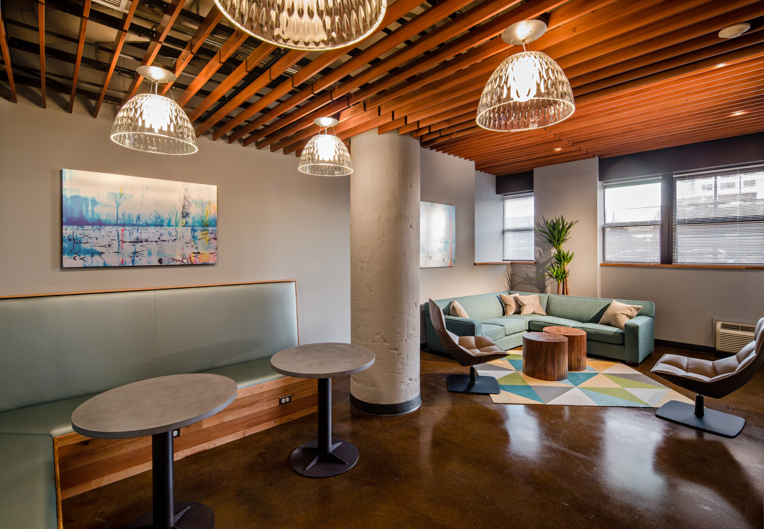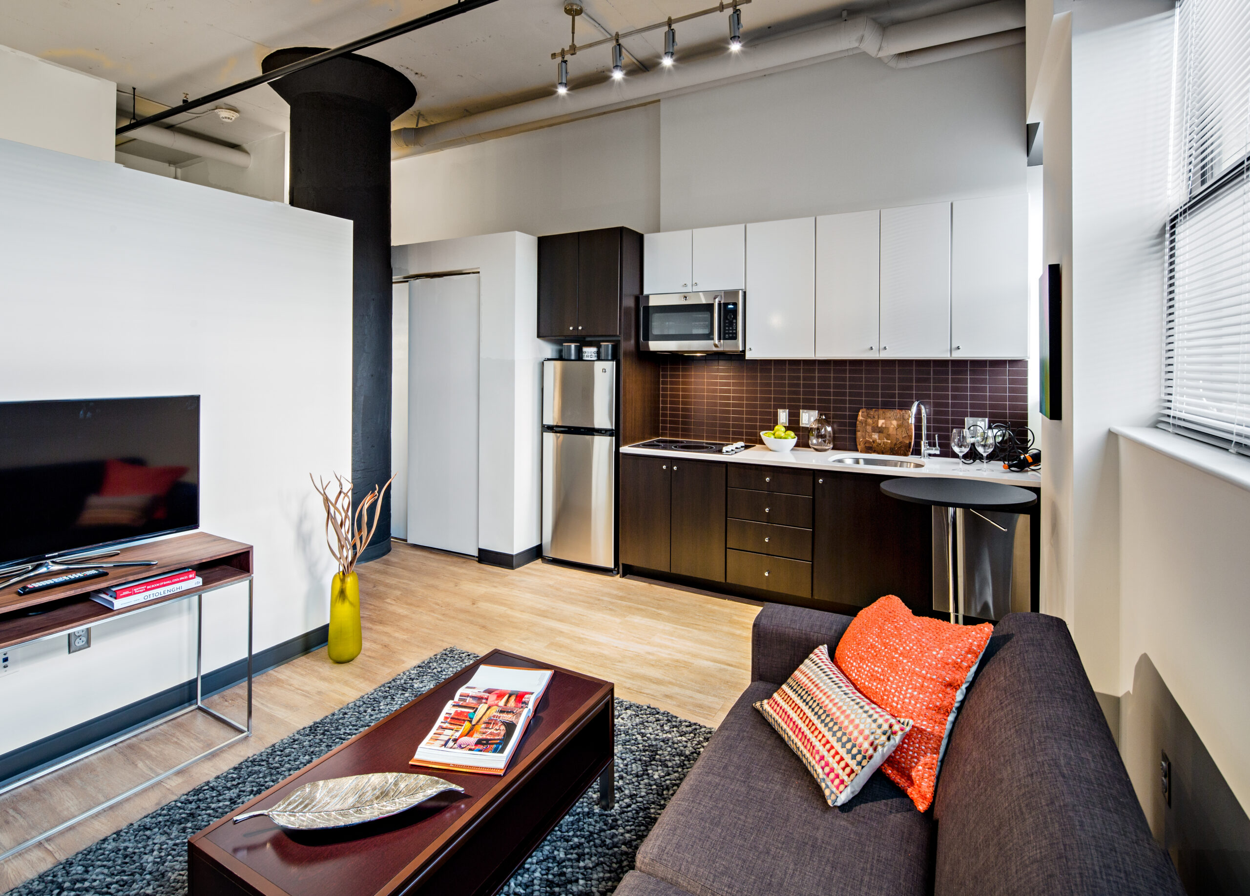 These studio apartments range in size from 330 to nearly 700 square feet, each with floor-to-ceiling windows and contemporary loft interiors and are designed to meet LEED-NC silver criteria.