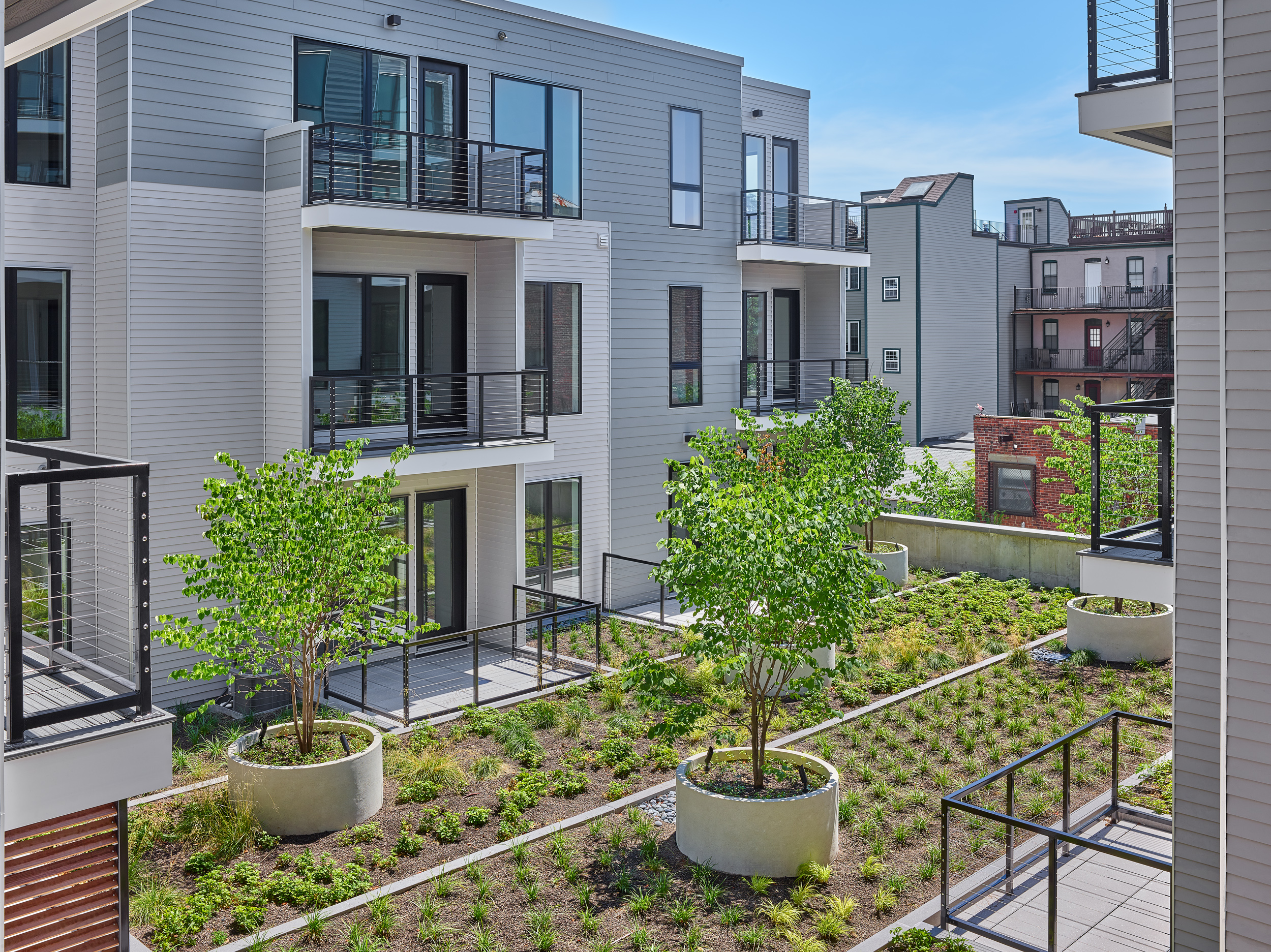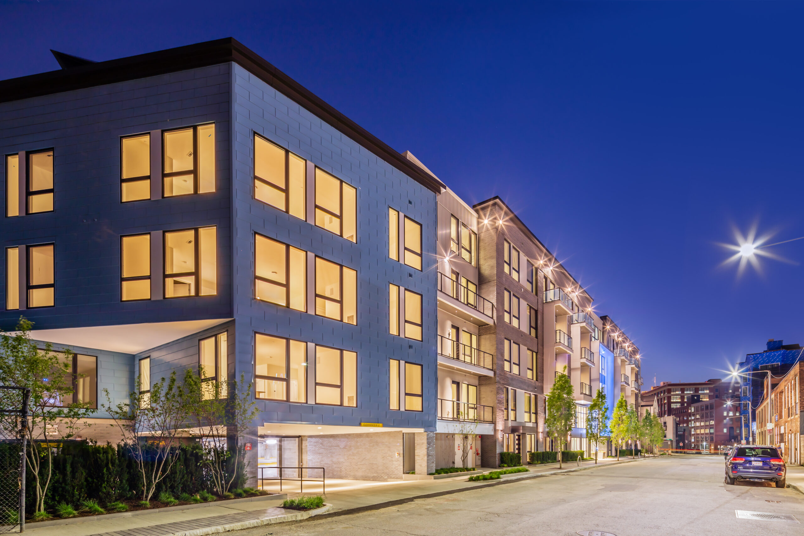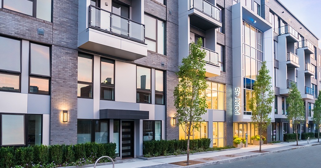 The 105 cutting edge homes range from one- to three-bedrooms, with a ground level, enclosed parking garage complete with electric car charging stations. The “E-shaped” plan creates a strong, street front façade along West Third, while the three building wings extending from this bar form two courtyards oriented to capture the optimum sunlight for unit patios and decks. These green roofs are landscaped to enhance views out from each unit, as well as the adjacent fitness and amenity spaces. A setback at the top floor creates a large, upper level common deck and club area for all residents – the deck looks north to offer views to downtown Boston and the Seaport. The exterior of Port 45 draws upon the predominant materials of the surrounding neighborhoods, with the use of grey brick and metal shingles and panels; however, the scale and detailing of these elements are decidedly modern.