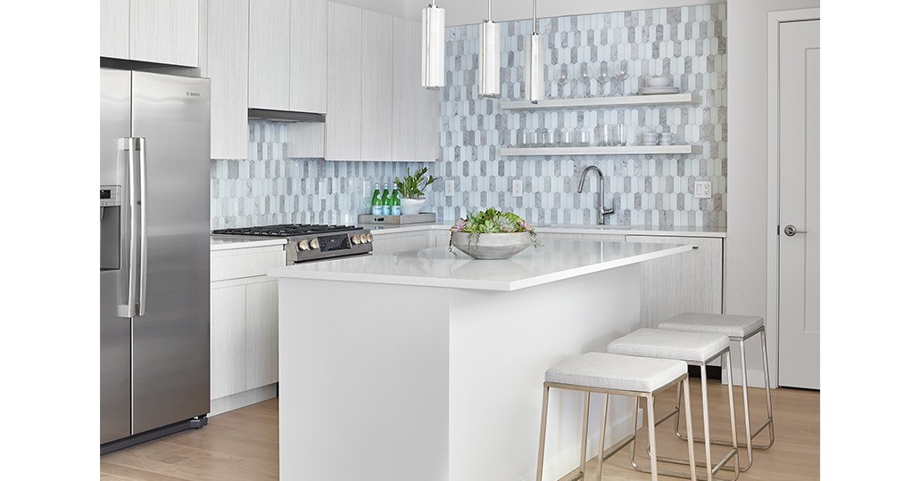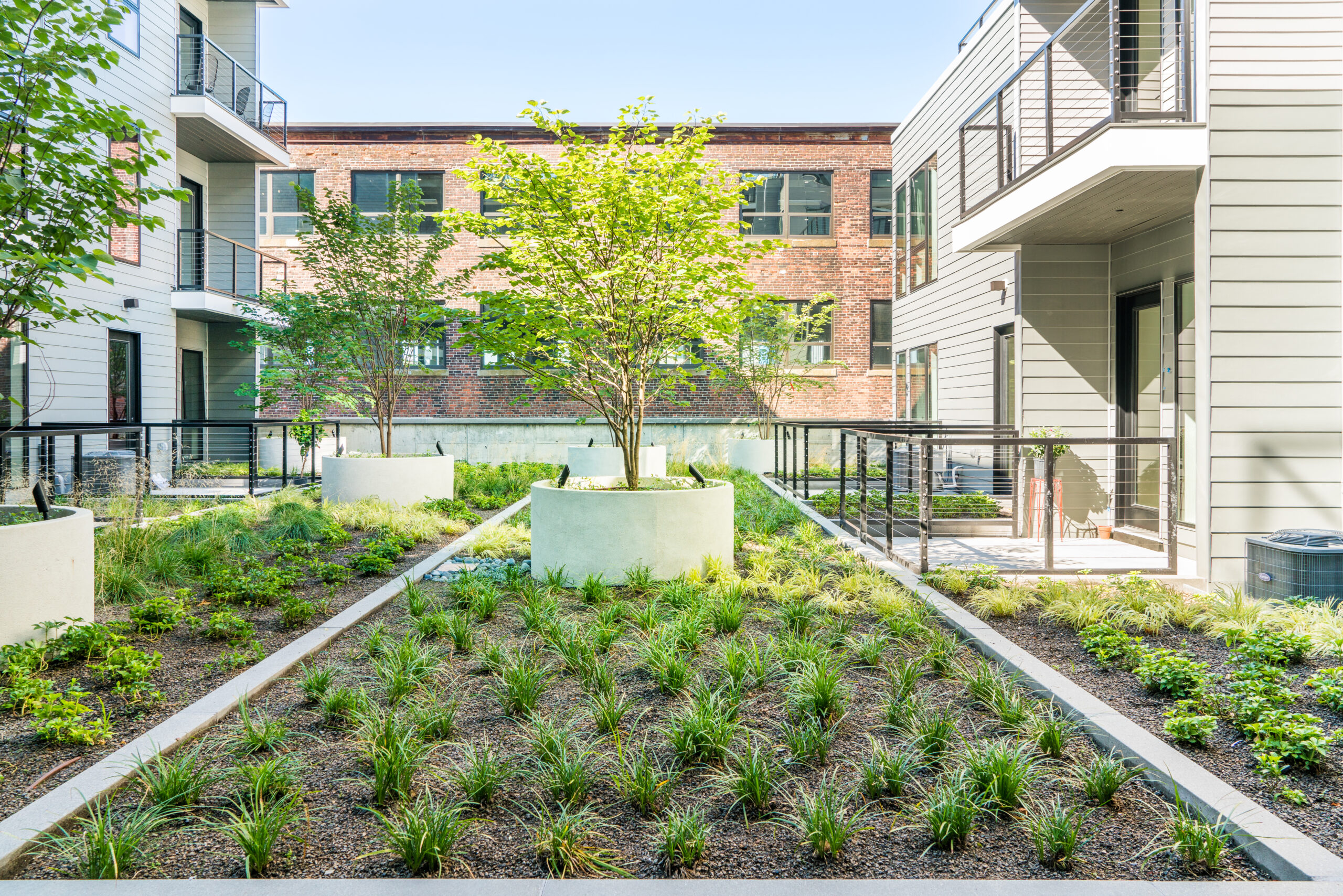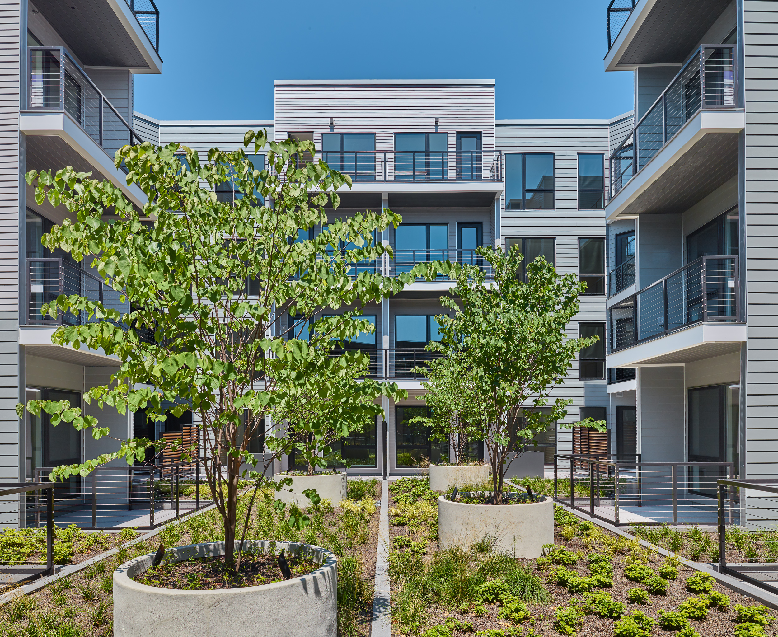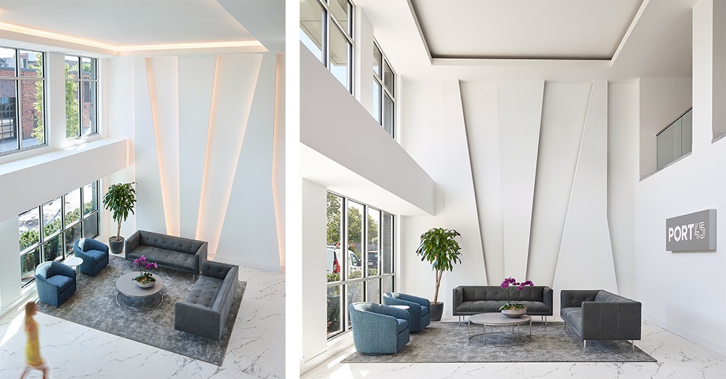 The 105 cutting edge homes range from one- to three-bedrooms, with a ground level, enclosed parking garage complete with electric car charging stations. The “E-shaped” plan creates a strong, street front façade along West Third, while the three building wings extending from this bar form two courtyards oriented to capture the optimum sunlight for unit patios and decks. These green roofs are landscaped to enhance views out from each unit, as well as the adjacent fitness and amenity spaces. A setback at the top floor creates a large, upper level common deck and club area for all residents – the deck looks north to offer views to downtown Boston and the Seaport. The exterior of Port 45 draws upon the predominant materials of the surrounding neighborhoods, with the use of grey brick and metal shingles and panels; however, the scale and detailing of these elements are decidedly modern.