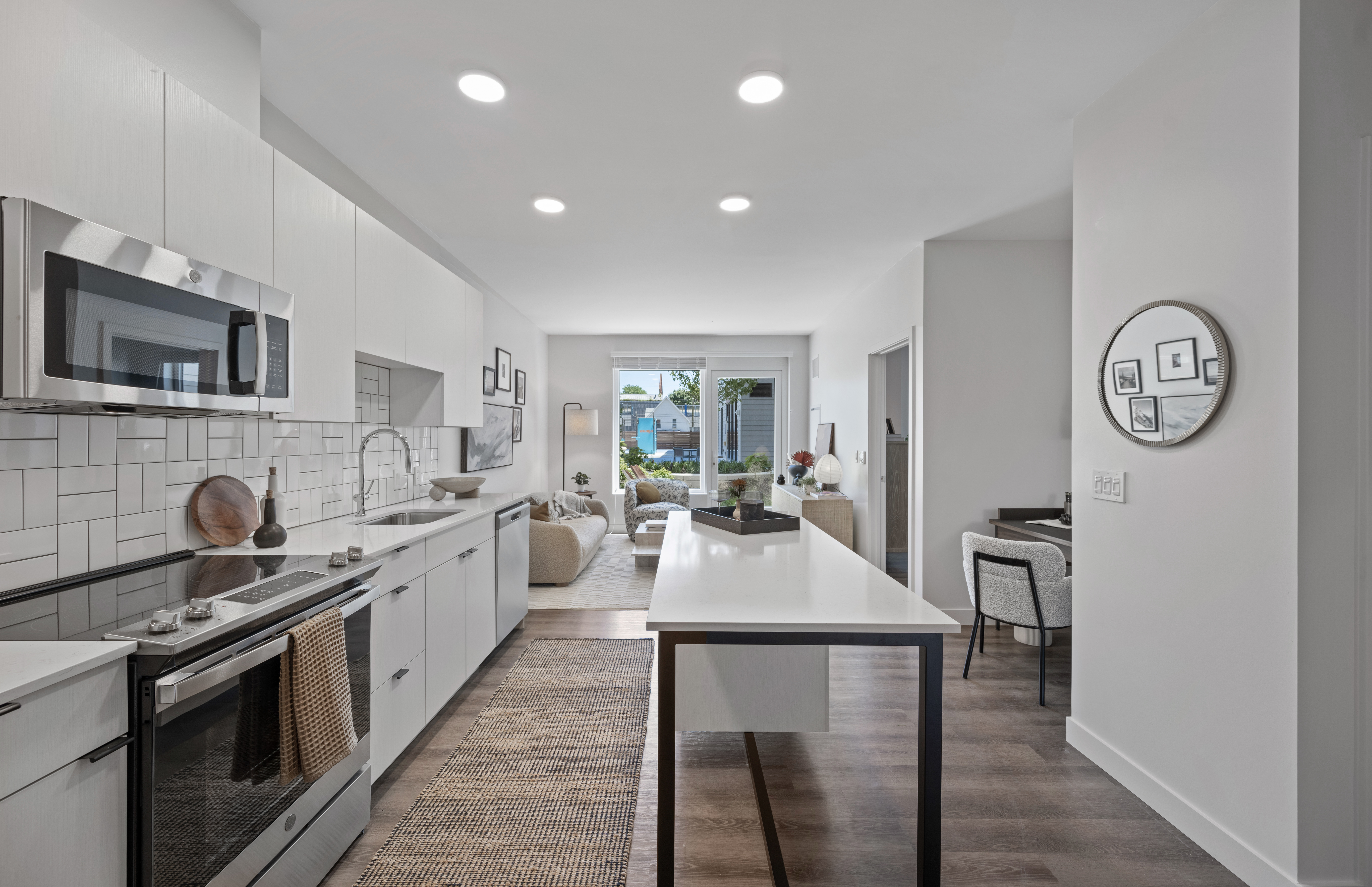 Amaya’s 475 apartments range from micro-units up to generous two bedrooms. The building layout wraps two generous outdoor courtyards, one with a pool and outdoor fitness, the other designed for more relaxation. Expansive amenity areas include a state-of-the-art fitness facility, a gaming arcade area, collaborative workspaces, a Chef’s kitchen tied to an outdoor terrace, and a pet spa equipped with elite grooming showers. Ground floor retail spills out onto the public square.