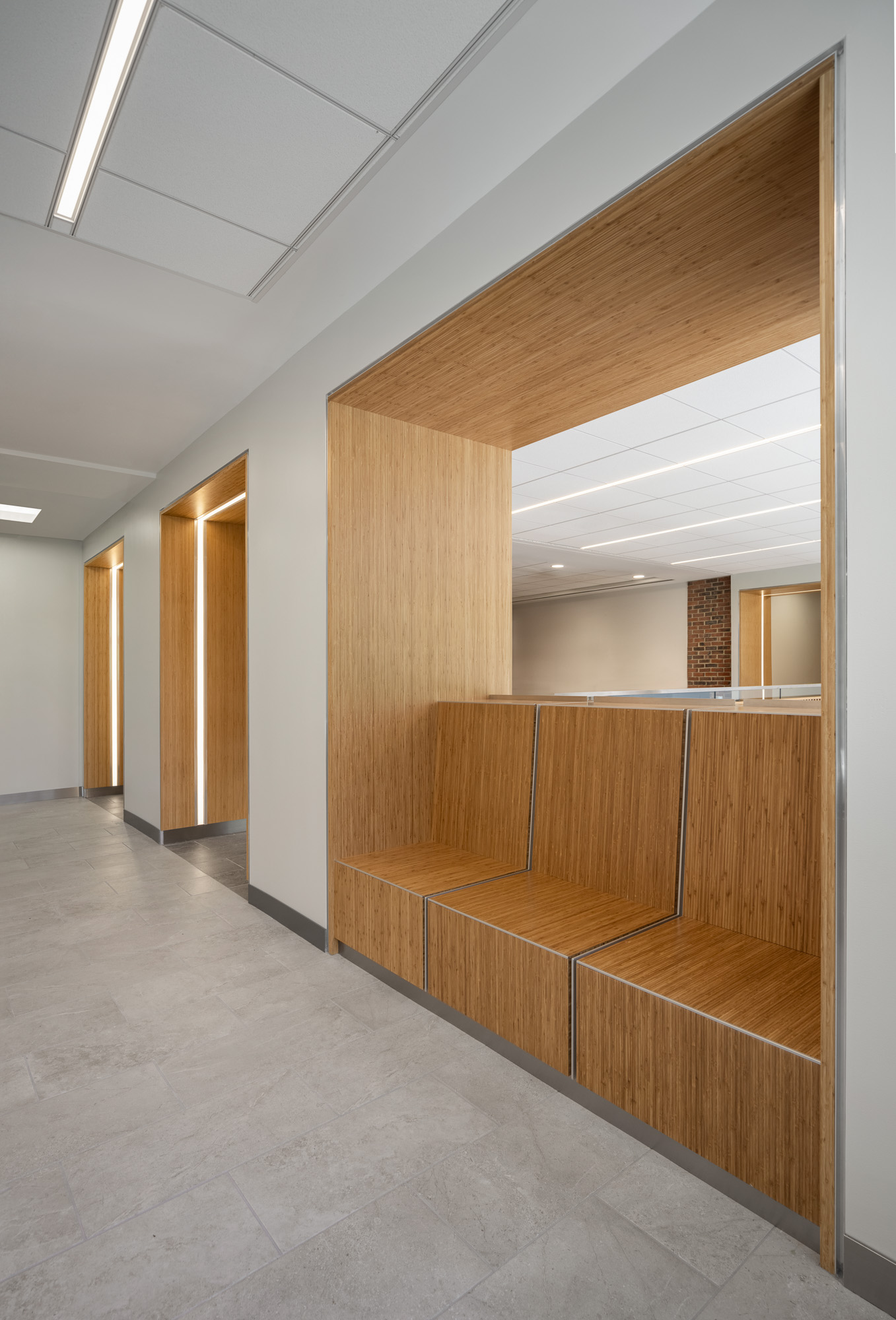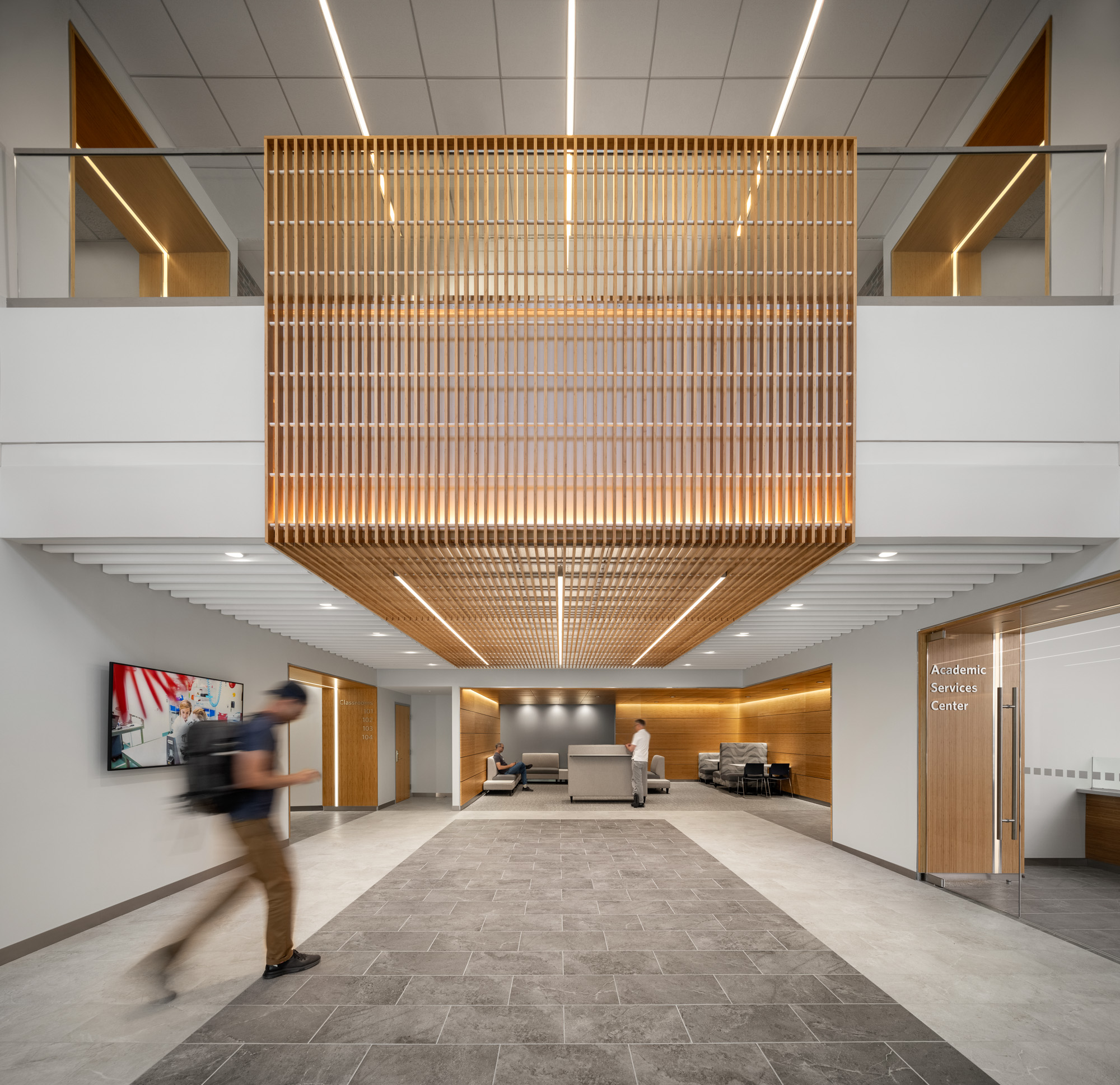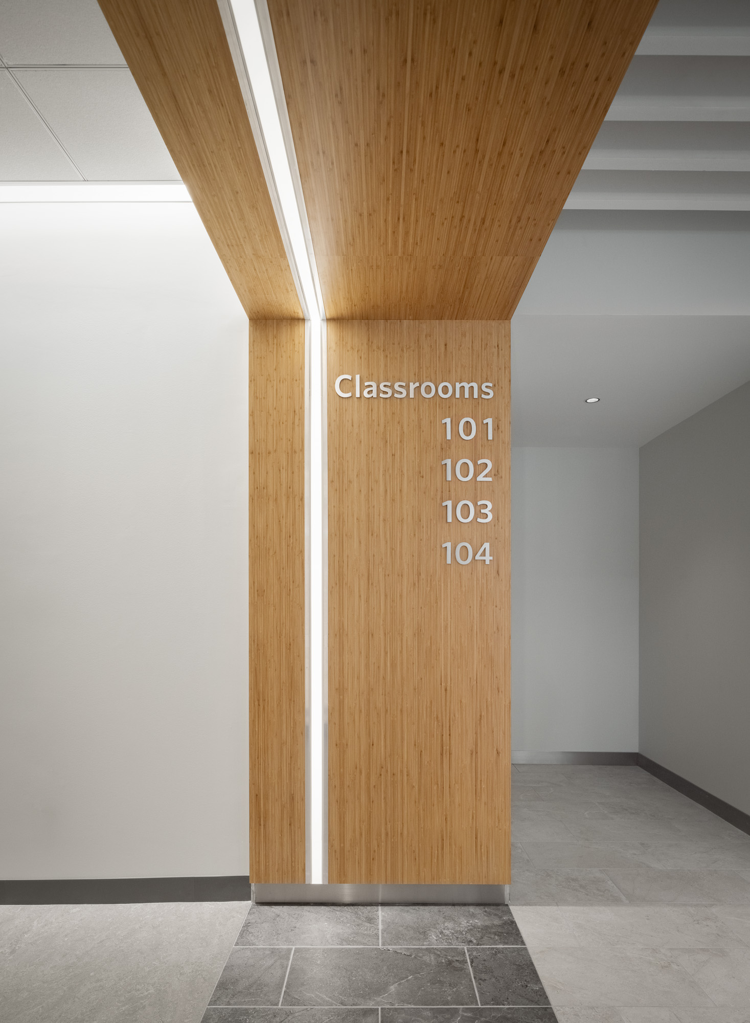 Inside the renewed vestibule, an expanded lobby gives direct access to the Academic Student Services suite, newly accessible restrooms, and four new classrooms. Two of these are tiered lecture halls with 85 and 100-seats. The others are seminar rooms. The lobby features a luminous bamboo-slat ceiling and a lounge/study space. Bamboo plywood portals help organize the spaces and provide wayfinding signs.