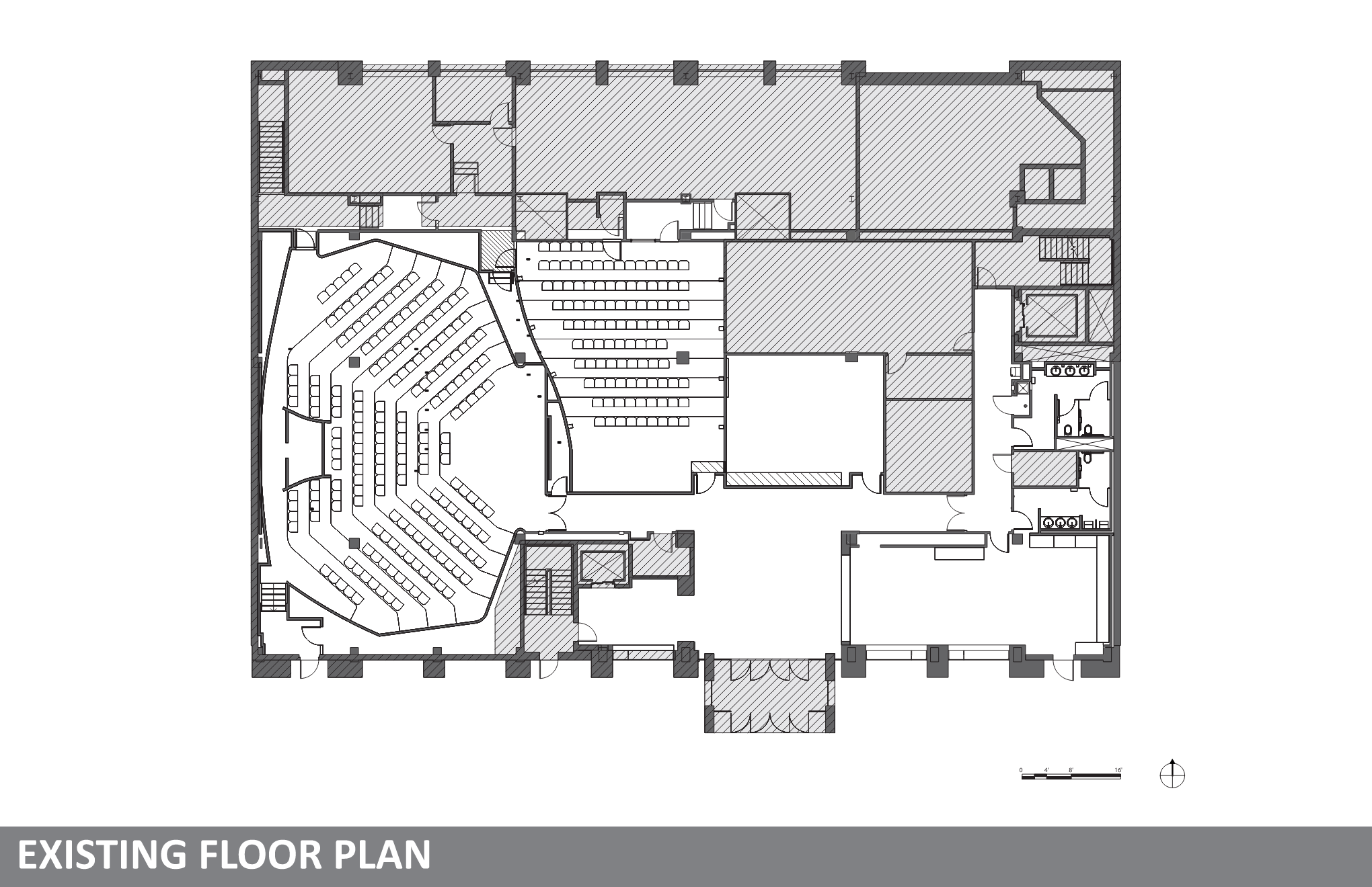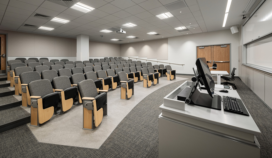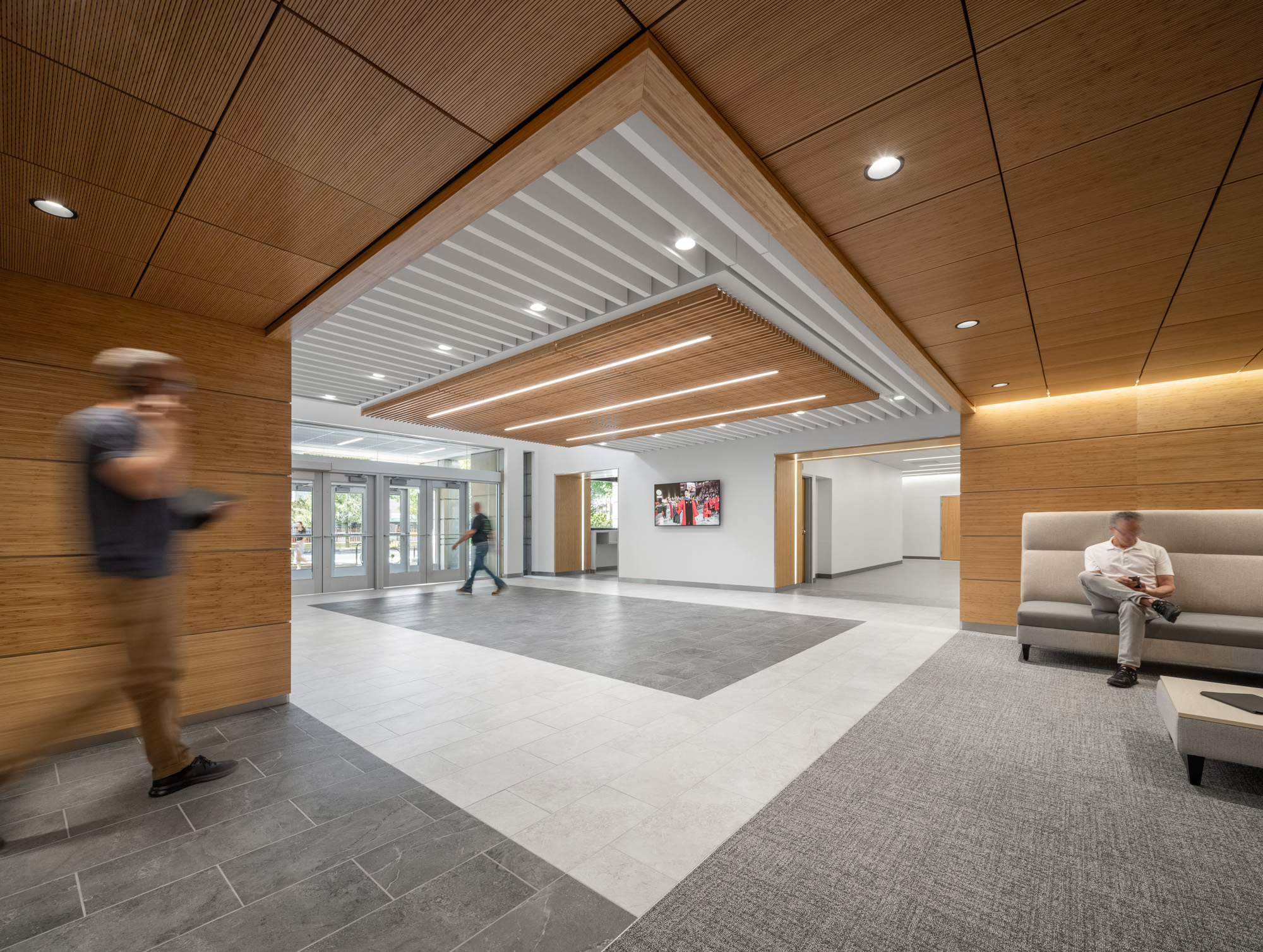 Inside the renewed vestibule, an expanded lobby gives direct access to the Academic Student Services suite, newly accessible restrooms, and four new classrooms. Two of these are tiered lecture halls with 85 and 100-seats. The others are seminar rooms. The lobby features a luminous bamboo-slat ceiling and a lounge/study space. Bamboo plywood portals help organize the spaces and provide wayfinding signs.