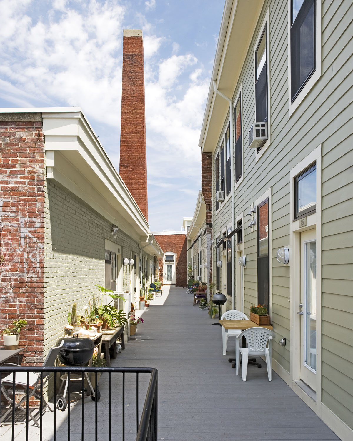 The complex now houses a range of unit types, including townhouses, open lofts reaching up into historic light monitors, and flats with private courtyards wrapped around the historic smokestack, exposing the original Roxbury puddingstone foundation. These spacious, sunny units enjoy a TOD location within steps of two transit stops, and contribute to the well-established artist-friendly community in Jamaica Plain.