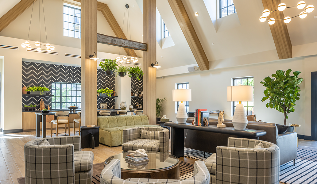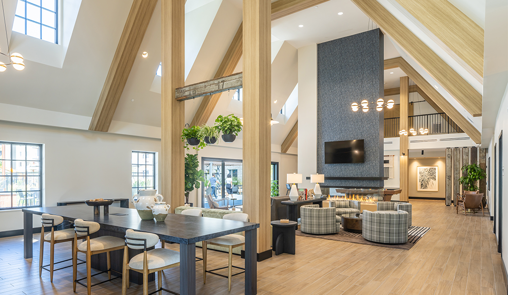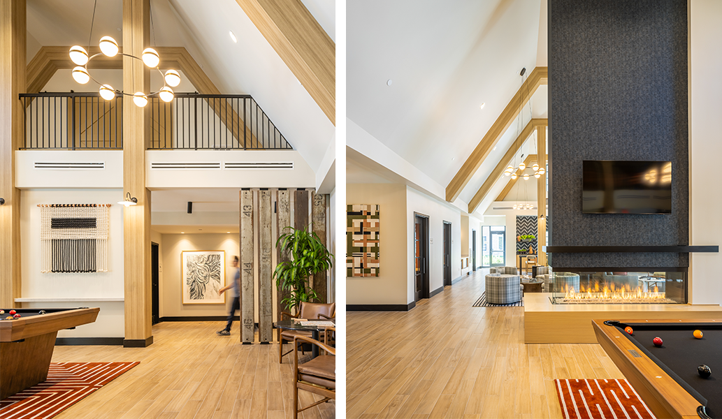 A three-sided fireplace anchors the Clubhouse, greeting residents with warmth and an impressive sense of scale. Around this focal point, residents enjoy amenities for productivity, wellness, and leisure, including a fitness center with private virtual workout pods, work-from-home suites with video-conferencing booths and printing stations, lounge and gaming areas, a catering kitchen, and a coffee bar that playfully honors the property’s dairy past. A pet spa with grooming station and the community’s leasing offices complete the program, reinforcing the Clubhouse as both lifestyle hub and functional anchor.