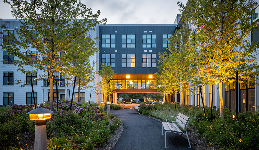Although one of the largest buildings at Pinehills, the façade settles into the landscape with its composition of traditional gable and dormer forms, taking advantage of the sloping topography to transition to and from neighboring sites. Offering a true sense of arrival, the entry volume recesses, while the building bridges over a path to invite pedestrians into the lushly landscaped courtyard. Balconies are strategically located and composed to give a residential character to the overall design.